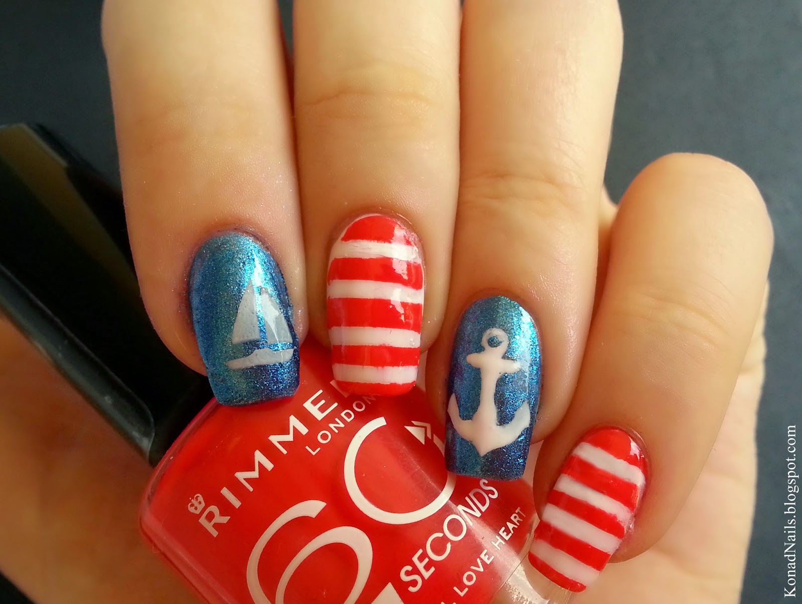 Today I'll show you another navy nail art. For this manicure, I used three polishes: Tip Top -Astronaut, ProNails -Extreme white and Rimmel -506 Central Love Heart. I used stripe vinyls and anchors from Nails Redesigned. On my thumb and index finger, I stamped the boat design and the helm from MoYou Nails' image plate 70. What do you think?