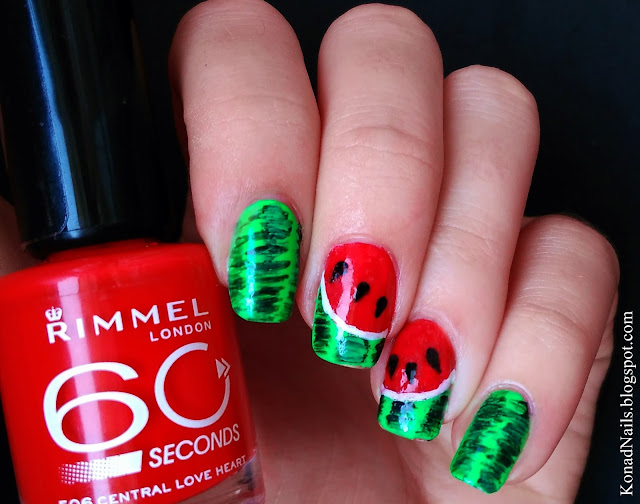 Maybe you've noticed already that I don't want summer to be over yet, so today I'll show you another manicure in theme with the hot season. This time I chose watermelon and these were inspired by @polishthatnail on intagram. The red nail polish I used was Rimmel - Central Love Heart and the green polishes were El Corazon - Matte Effect #145 Neon and Avon - Green with envy (the darker shade). With a thin brush, I created all the details and finished with clear top coat. What do you think?