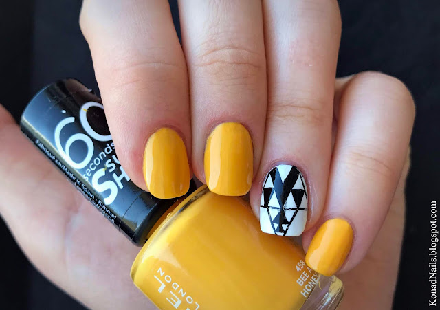 Today I'll show you a simple honey yellow manicure with an eye-catchy accent nail. I used Rimmel - Bee a honey on all nails except from my ring fnger, where I applied a coat of white nail polish. Then, using Born Pretty's black stamping polish I created the design from their BP-77 stamping plate. In the end, I applied Seche Vite top coat for some extra shine and that was it. What fo you think?